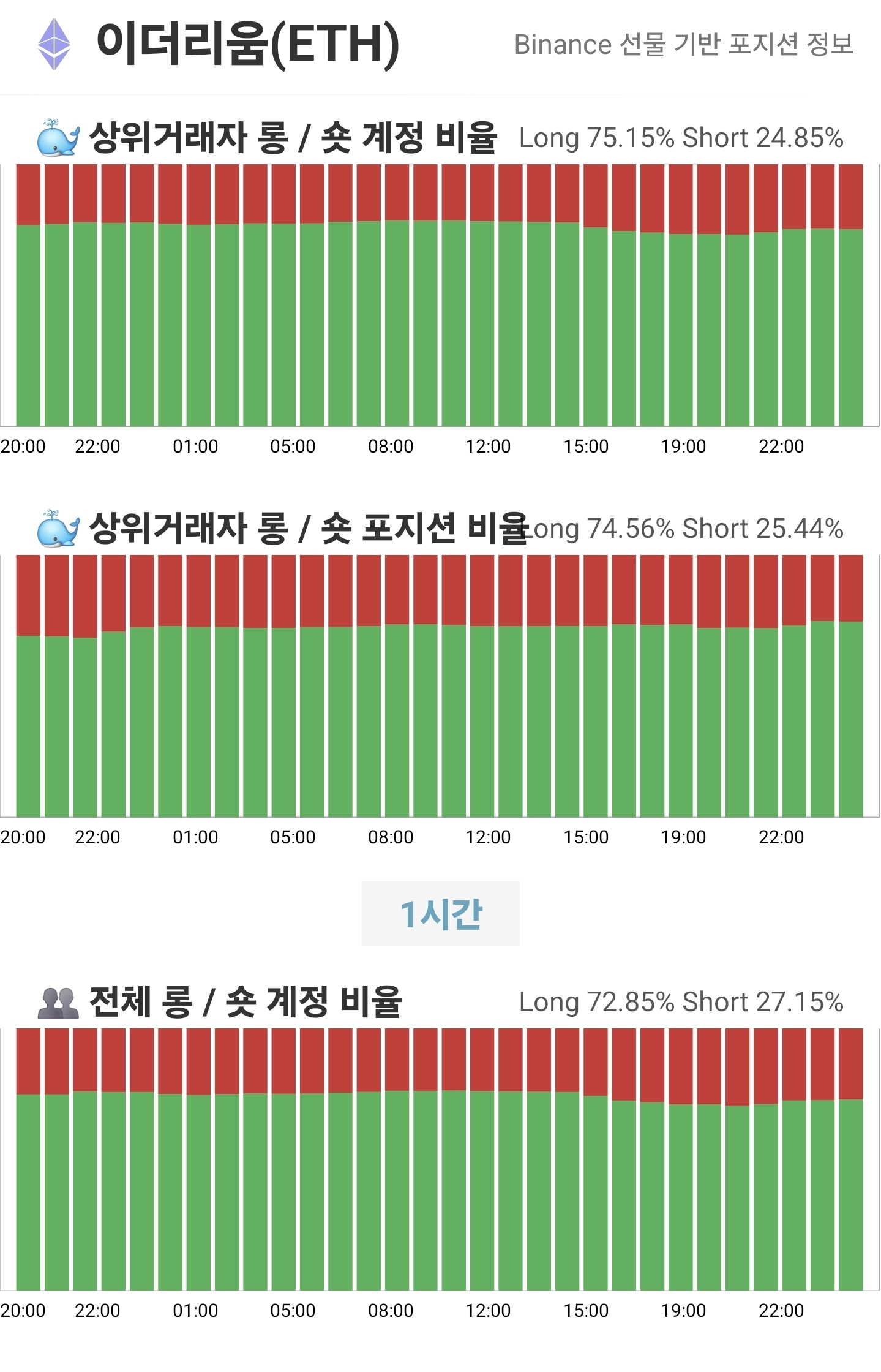 * 시간대별 변동: 막대 그래프의 길이(비율)가 시간대에 따라 미세하게 변화하고 있지만, 전반적인 추세(롱이 숏보다 훨씬 많음)는 지정된 24시간 동안 지속적으로 유지되고 있습니다.